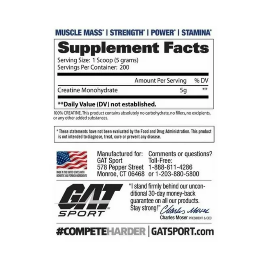 GAT SPORT 100% Monohidrato de creatina en polvo – 1000 gr – 200 porciones – Para hombres y mujeres – Sin Sabor – 100’% Creatina Micronizada de alta pureza