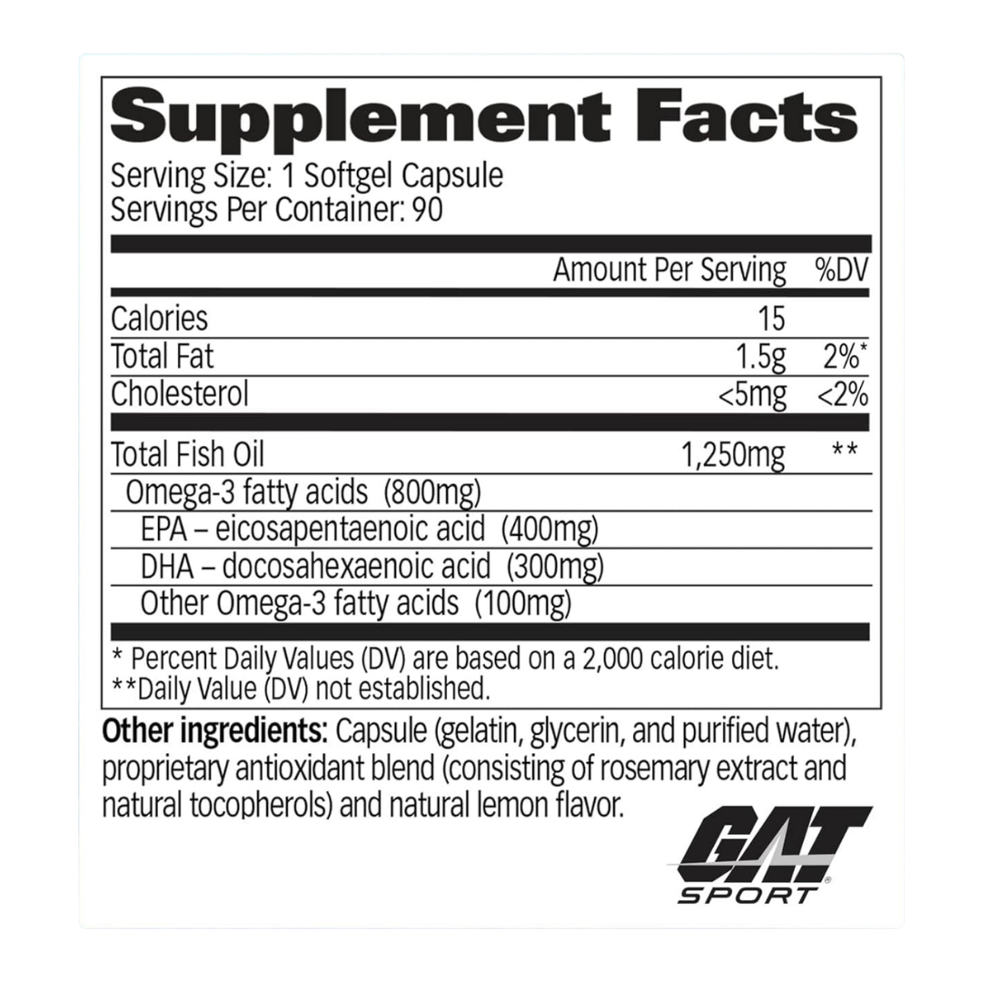 GAT Sport Essentials – Omega 3 Aceite de Pescado Purificado – 90 Softgels – 90 Porciones – 1250 mg por Porcion de Aceite de Pescado